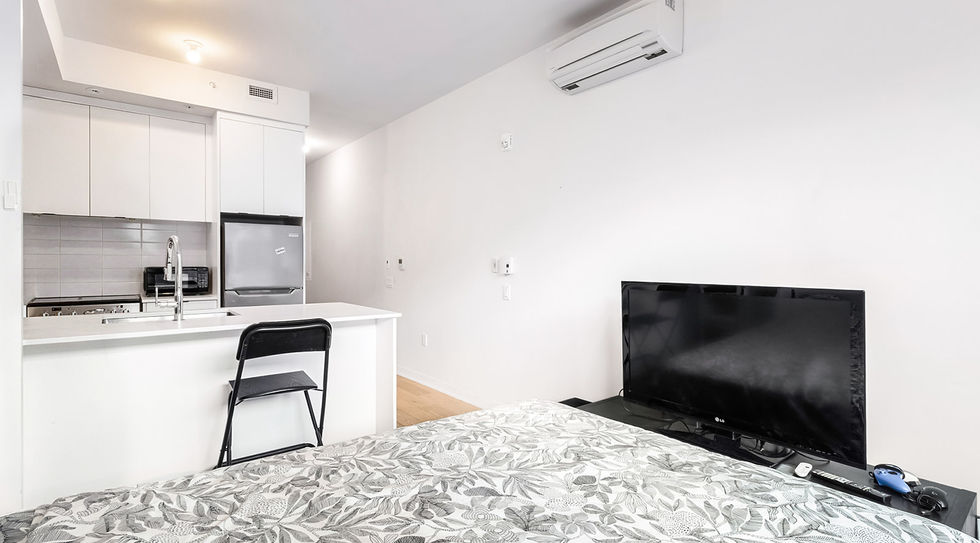 Complètement meublé, réfrigérateur, cuisinière, lave-vaisselle, laveuse et sécheuse.